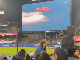 The Citi Field scoreboard showed the Artemis II astronauts returning safely to Earth