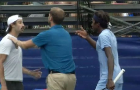 Australian Jordan Thompson was held back by the chair umpire in a heated clash against Sweden's Elias Ymer at the Citi Open in Washington DC.