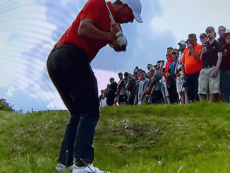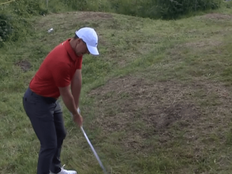 In the third round of The Open, Rory McIlroy’s drive finds the right rough on the par-4 11th hole. McIlroy hacks out his approach and uncovers a second ball buried underneath his, causing his shot to knuckle down the fairway en route to making bogey.