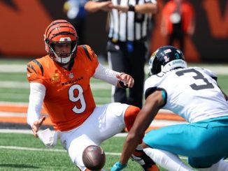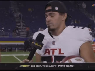 Falcons kicker John Parker Romo, signed just last week and named Player of the Game for going 5 for 5 on FG’s, meets teammate Leonard Floyd during post game interview September 15, 2025 admin 0