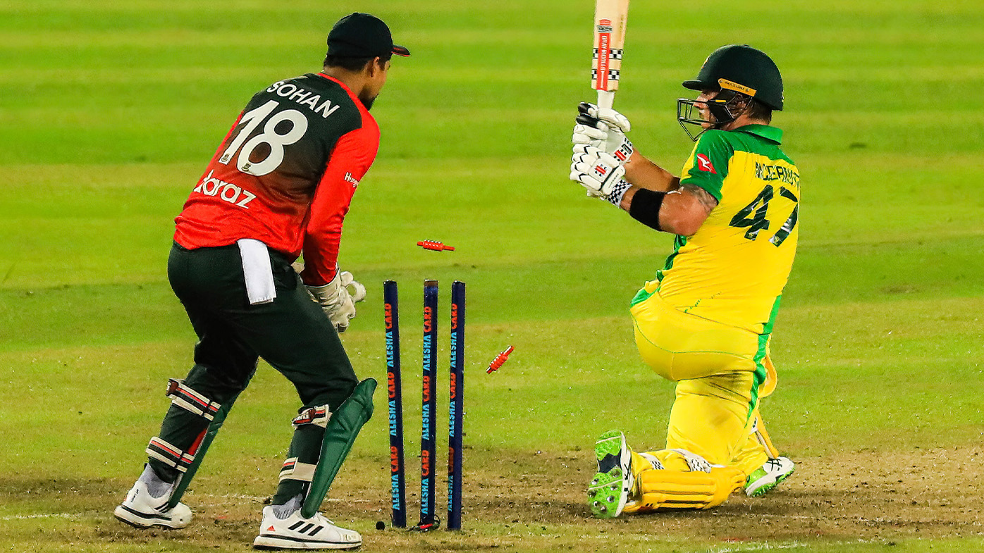 Matthew Wade top-scored for Australia with 22, but the veteran was brought undone by a cross-bat shot when he tried to pull a flat, quick Al Hasan delivery through midwicket. Wade missed the ball and it crashed into the stumps.