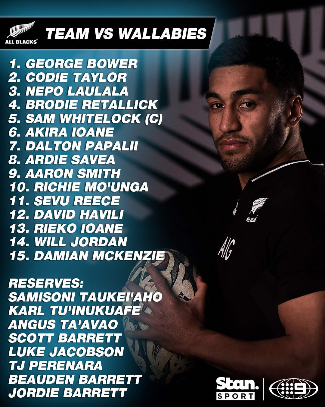 ALL BLACKS (15-1): Damian McKenzie, Will Jordan, Rieko Ioane, David Havili, Sevu Reece, Richie Mo'unga, Aaron Smith, Ardie Savea, Dalton Papalii, Akira Ioane, Sam Whitelock (c), Brodie Retallick, Nepo Laulala, Codie Taylor, George Bower