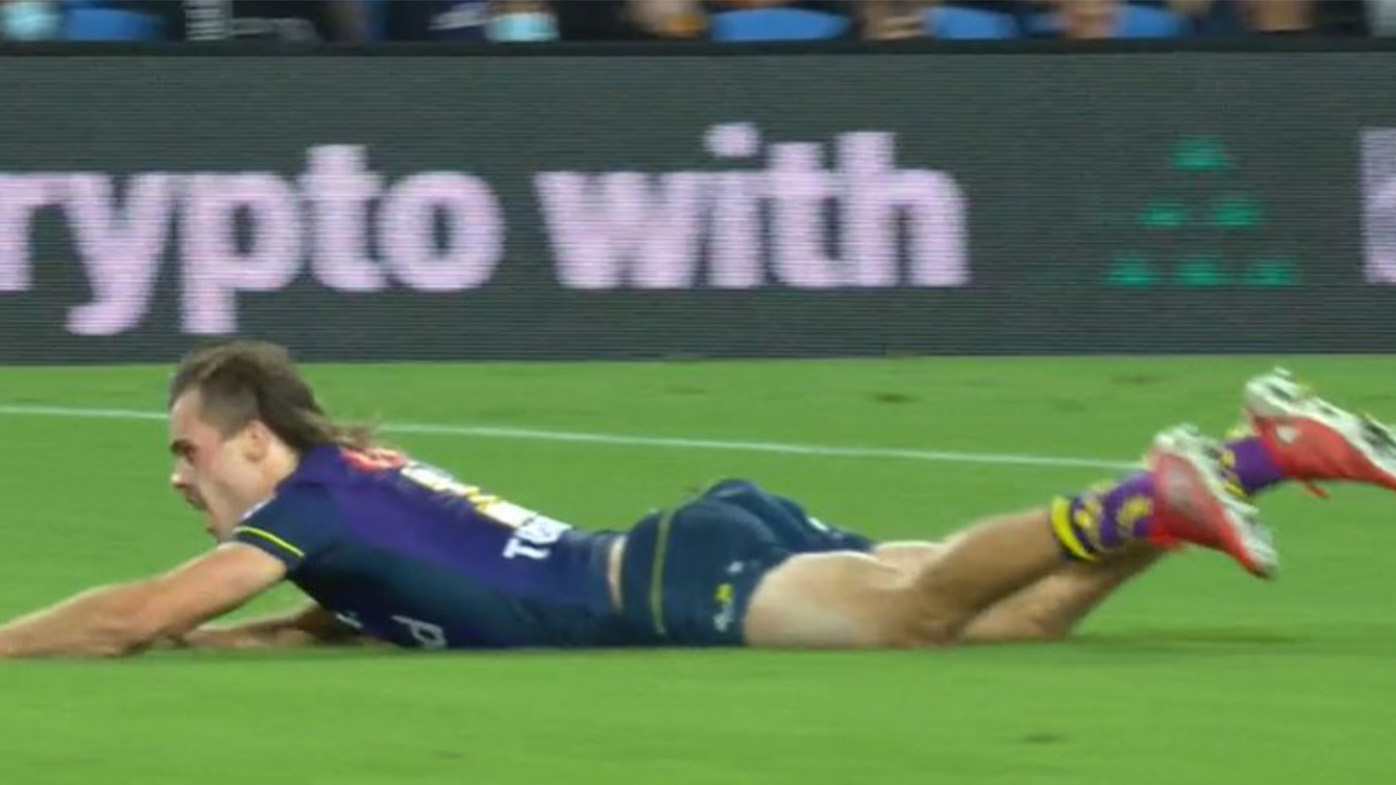 Papenhuyzen scores his first try since round six late in the first half off a slaloming run deep in Cronulla territory.