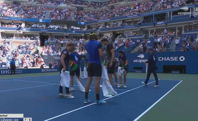 Then in unexpected scenes, Harris, Zverev, the chair-umpire and ball people all participated in cleaning the court for about five minutes. The rivals even stood and chatted for a moment or two before resuming the match.