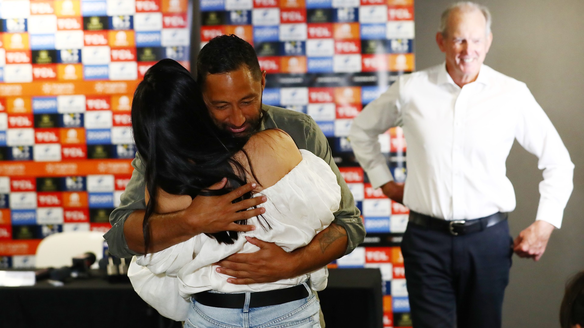 He enjoyed an embrace with his outgoing coach as the press conference concluded, while teammates including Tom Burgess and Damien Cook sat in the front row and applauded.