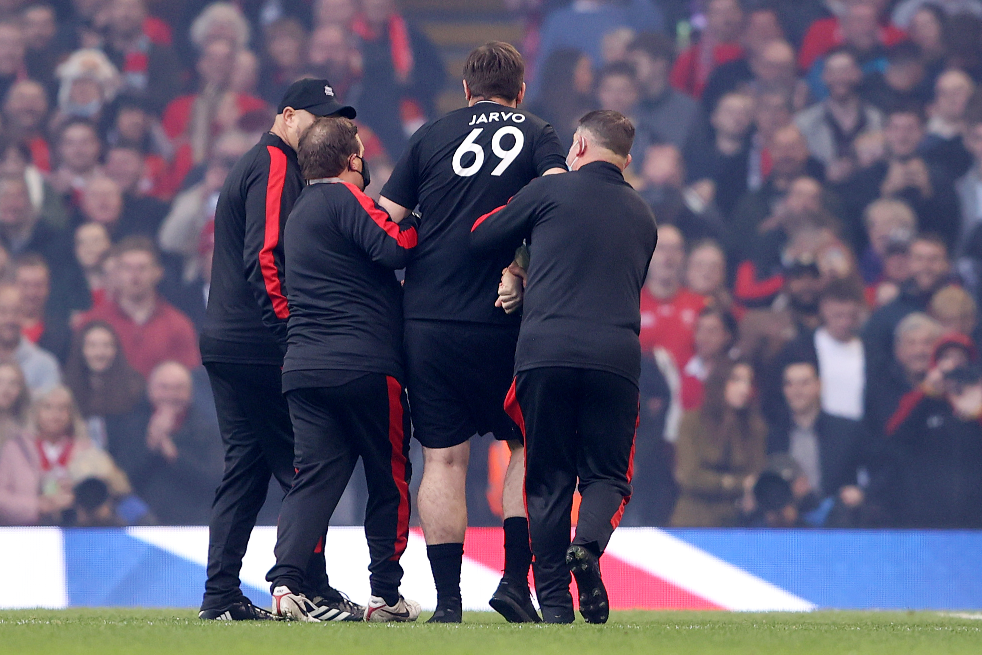 Notorious pitch invader Daniel Jarvis has struck again, joining the All Blacks for the New Zealand national anthem in Cardiff this morning before being escorted out of the Principality Stadium by security.