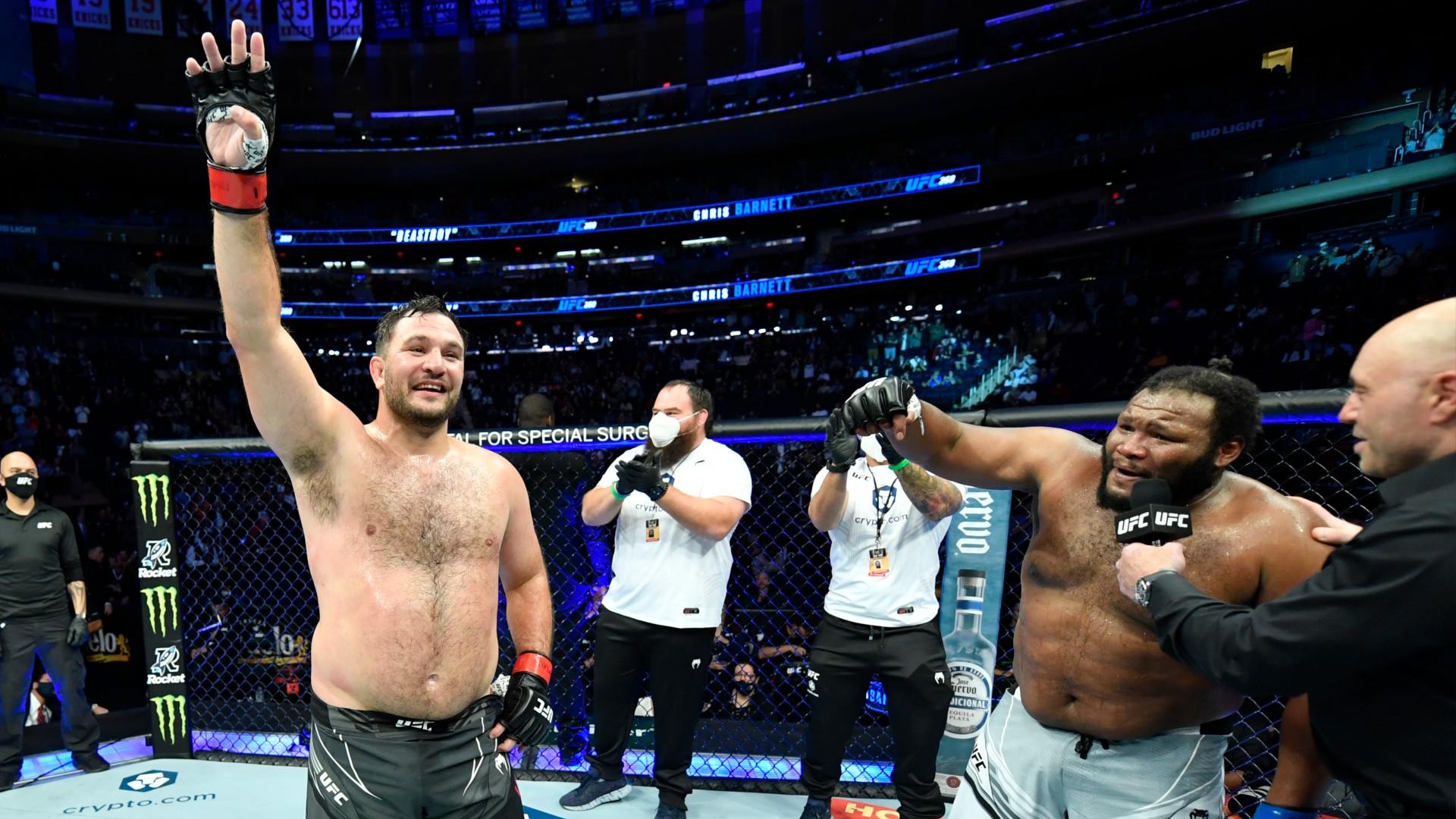 We've seen spinning kicks in the UFC before, and we've seen celebratory somersaults – but how about both in the space of 10 seconds from a 120kg man?