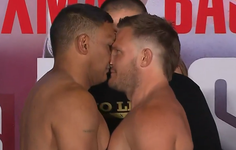 Former NRL players also featured at today's weigh-in, with Justin Hodges and Nathan Ross almost sharing a kiss when coming nose to nose during the face-off. Ross made out like he wanted to shake hands first then both men somehow ended up joined at the face.