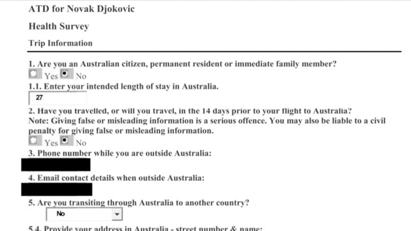 Djokovic declared he had not travelled and would not do so in the 14 days leading to his arrival in Australia on Wednesday January 5, according to a travel declaration submitted as evidence to the court determining whether he would be allowed to remain in Australia.