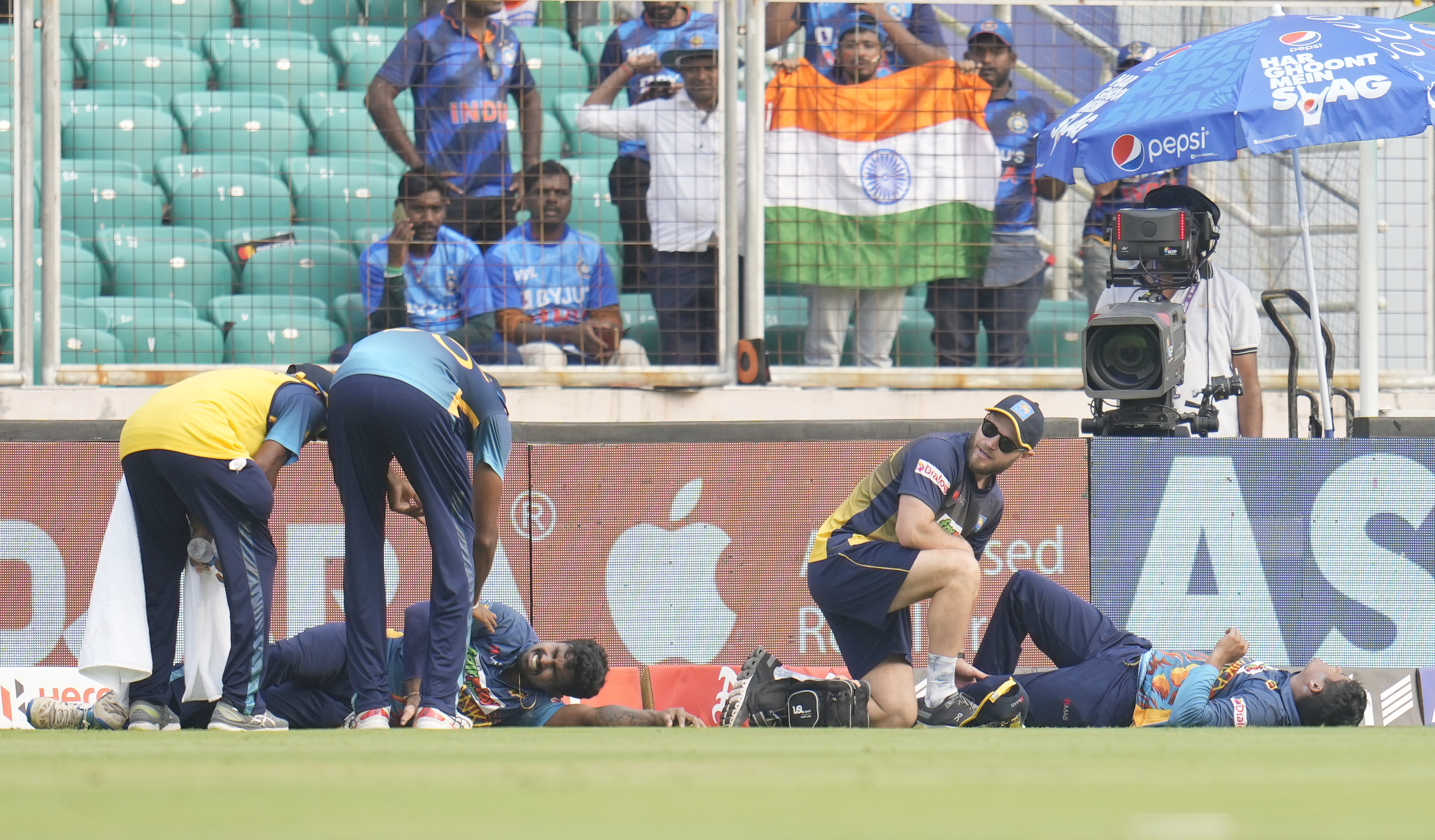 In one of the darkest on-field days in Sri Lankan cricket, two of their stars were stretchered off after a heavy collision in the outfield, before their batting lineup capitulated to the biggest loss in ODI history.