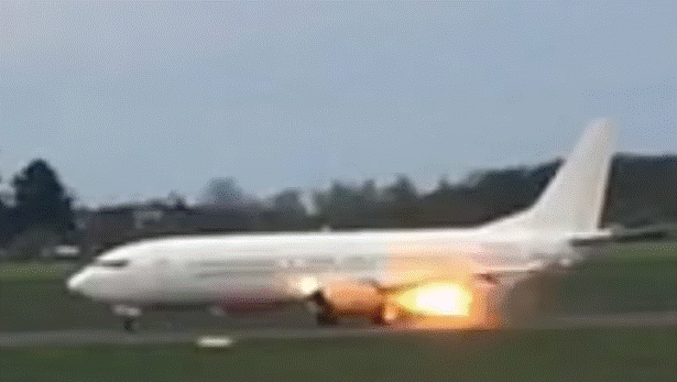 According to reports from Germany, a bird flew into the engine, causing the fire which resulted in a loud bang just before the plane took off. Flames were seen billowing from the aircraft, before passengers were evacuated.