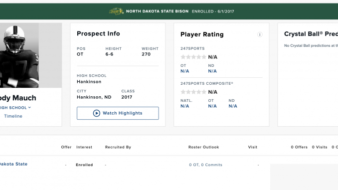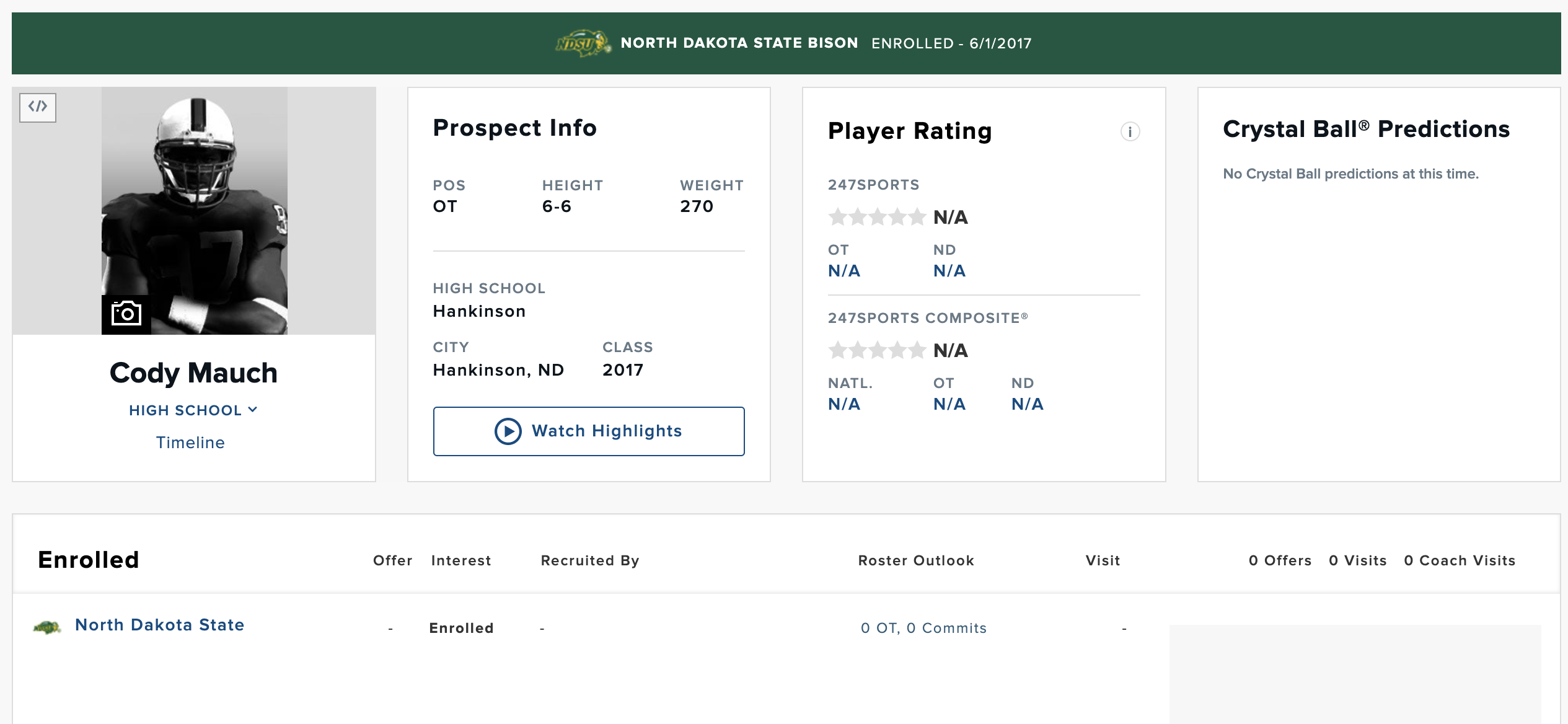 Below is a screenshot of the 247Sports recruiting page for Mauch from 2017. He doesn’t have any prospect stars. He didn’t have any college offers (even from NDSU, he enrolled but wasn’t offered by the football program). He doesn’t even have a headshot on the site.