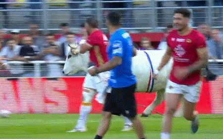 Catalans owner Bernard Guasch, who is also the head of a meat processing company in the region, arranged for "three prize-winning bulls, as well as two cows from the same Gascon breed" to "perform a lap of honour during the warm-up" according to a club statement before the game.
