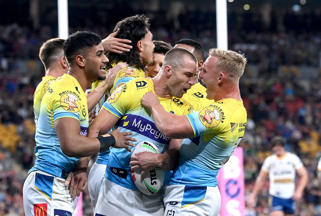 Titans centre Brian Kelly and Eels new signing Andrew Davey both scored in the last ten minutes with the Titans holding on.