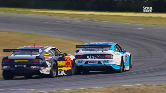 In the final race of the SpeedSeries season opener at Symmons Plains, the pair engaged in a battle over fourth place.