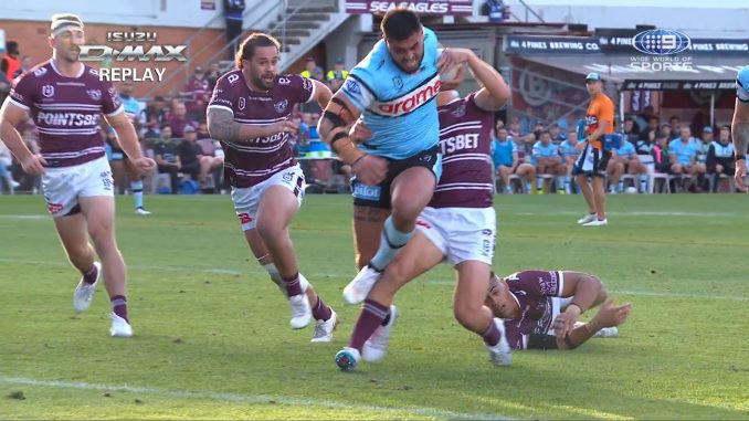 In the 19th minute, Aloiai attempted to tackle Sharks winger Ronaldo Mulitalo but fell awkwardly when he slipped out of his grasp. The Manly enforcer then clutched at his shoulder and had to be taken from the field.