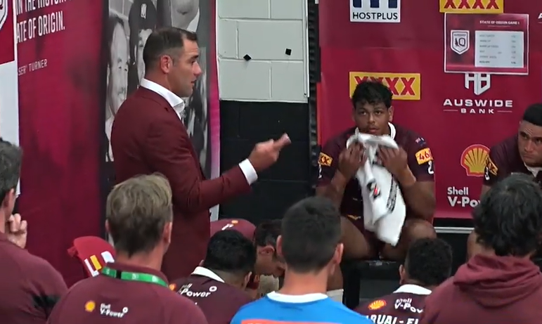 The State of Origin great was captured in the sheds after the first half, taking a rest from his commentary duties to inspire the troops.