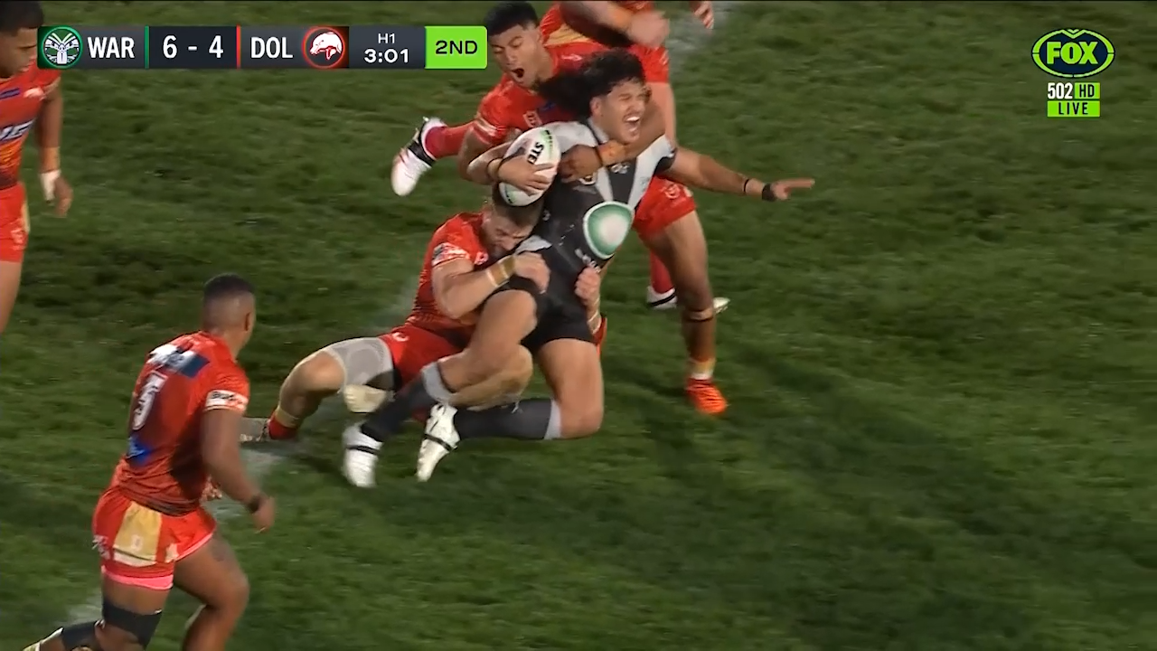 "DWZ has got momentum, he's gone through the tackle. Aitken has lost the tackle, turned around, lost feet.