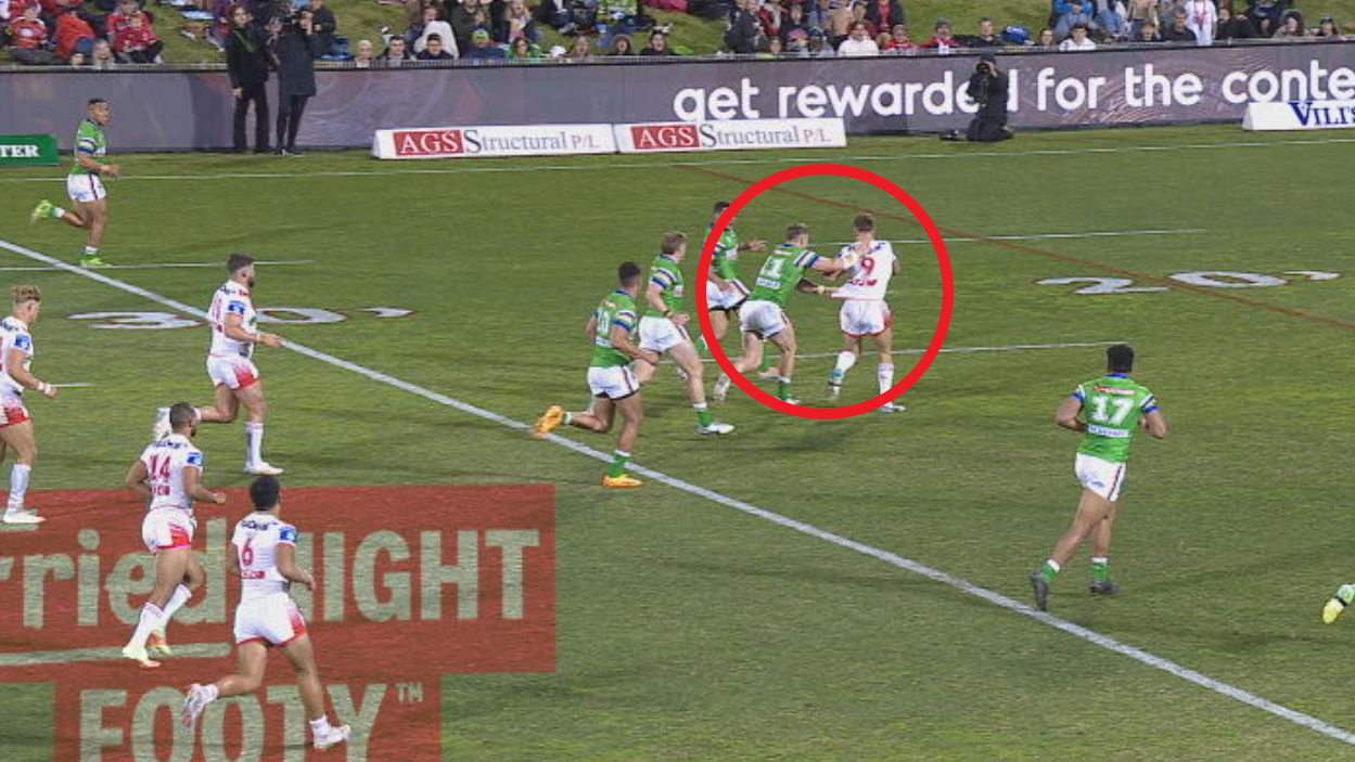 With the Raiders holding a four-point lead, Dragons hooker Jacob Liddle broke through the line before Young ran him down and dislodged the ball with a strong tackle.