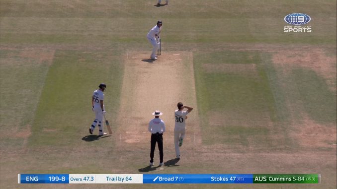 Stuart Broad 7 (8): c Steve Smith, b Pat Cummins