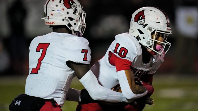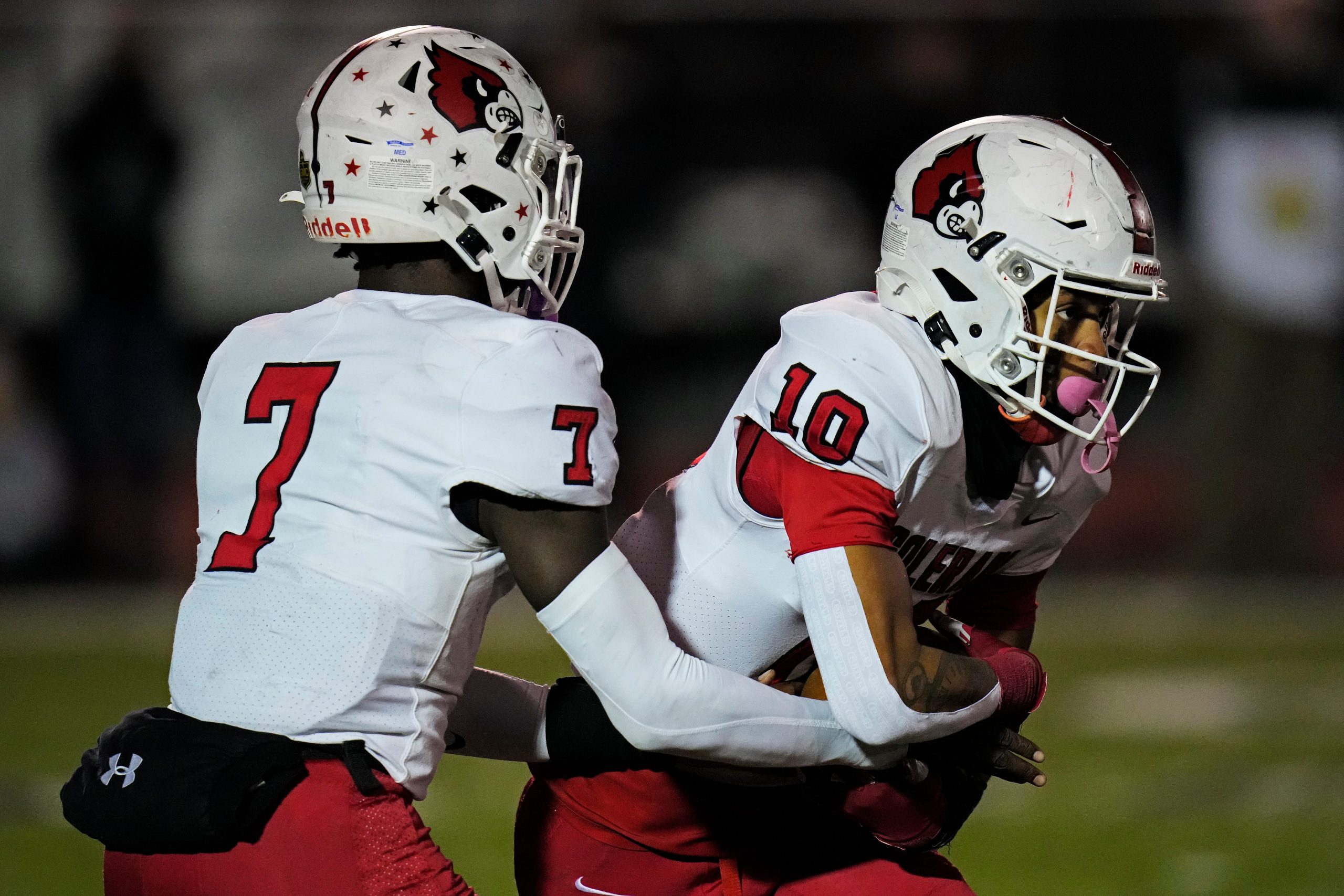 (Colerain quarterback Zacchaeus Jennings (7) hands off to running back Dashawn Hopper (10) in the second quarter of the first OHSAA DIV I Playoff game between the Mason High School Comets and the Colerain High School Cardinals at Atrium Stadium in Mason, Ohio, on Friday, Oct. 28, 2022.)