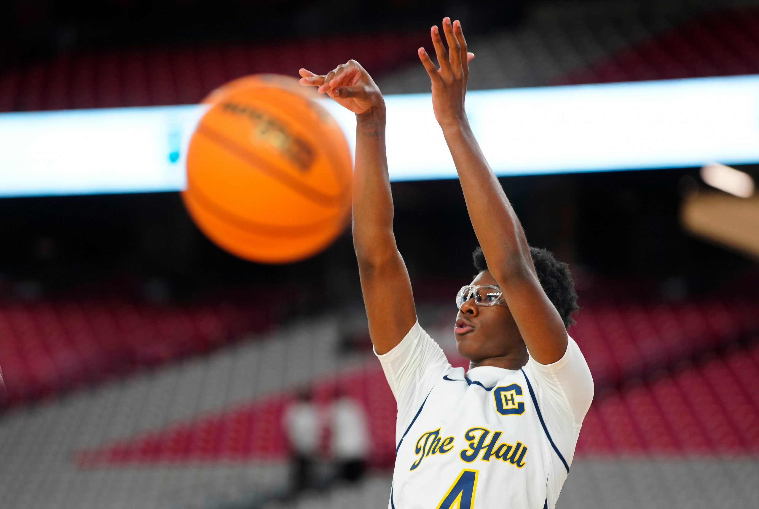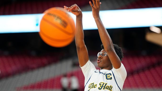 Campbell Hall guard Bryce James (4) warms up with his team during the Section 7 Basketball Tournament at State Farm Stadium in Glendale on June 23, 2023.