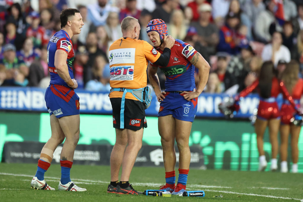Kalyn Ponga has given Newcastle a major concern after he left the field late in the second half following a big hit from Sharks centre Jesse Ramien.