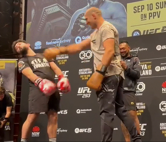 And as expected some random fan brought down gloves and took to the stage to throw hands with a gloved up Strickland. It was all in good fun as the UFC star popped the fan in the face a few times.