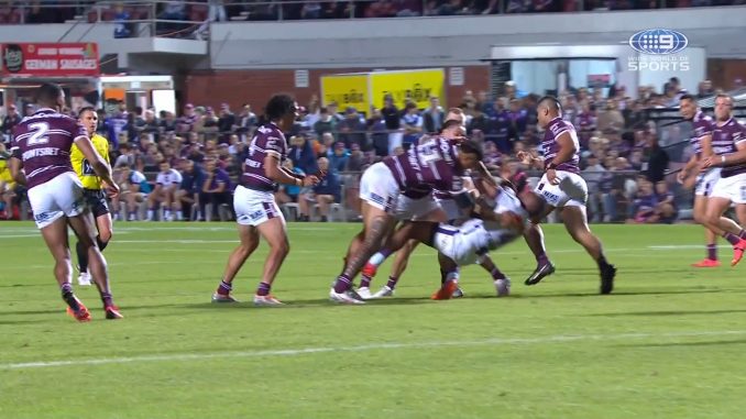 The tackle in question (watch in the video below) was a double whammy way back in April, with Manly enforcers Haumole Olakau'atu and Josh Aloiai rocking Olam and knocking him on his back as he came flying towards the defensive line in his usual no fear fashion in Manly's 18-8 win at 4Pines Park.