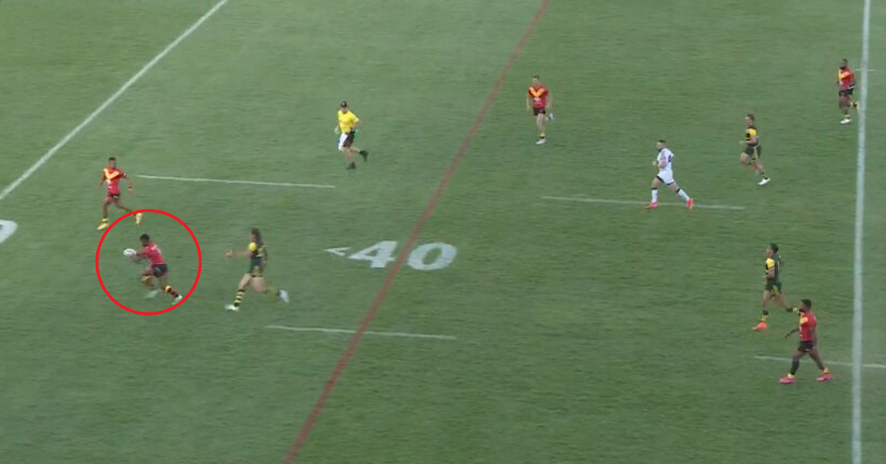 In the first half of the men's game the PNG side's Kyle Laybutt kicked a drop out 75 metres, forcing Cody Walker and Jake Trbojevic to run backwards before the Manly forward carted the ball back towards the halfway line.