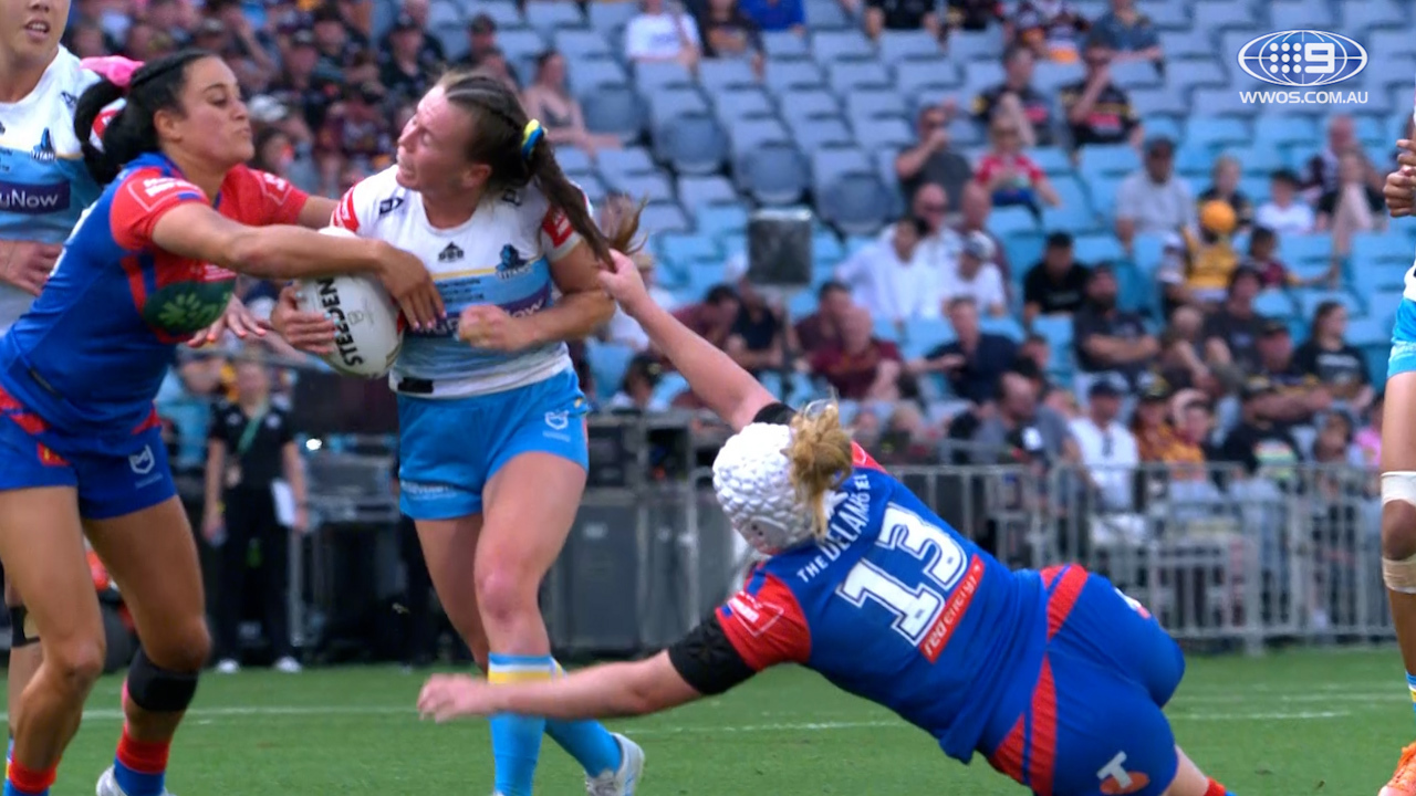 Titans captain Georgia Hale was the victim of the act, palming off Southwell with the Knights lock gripping onto her hair in the tackle.