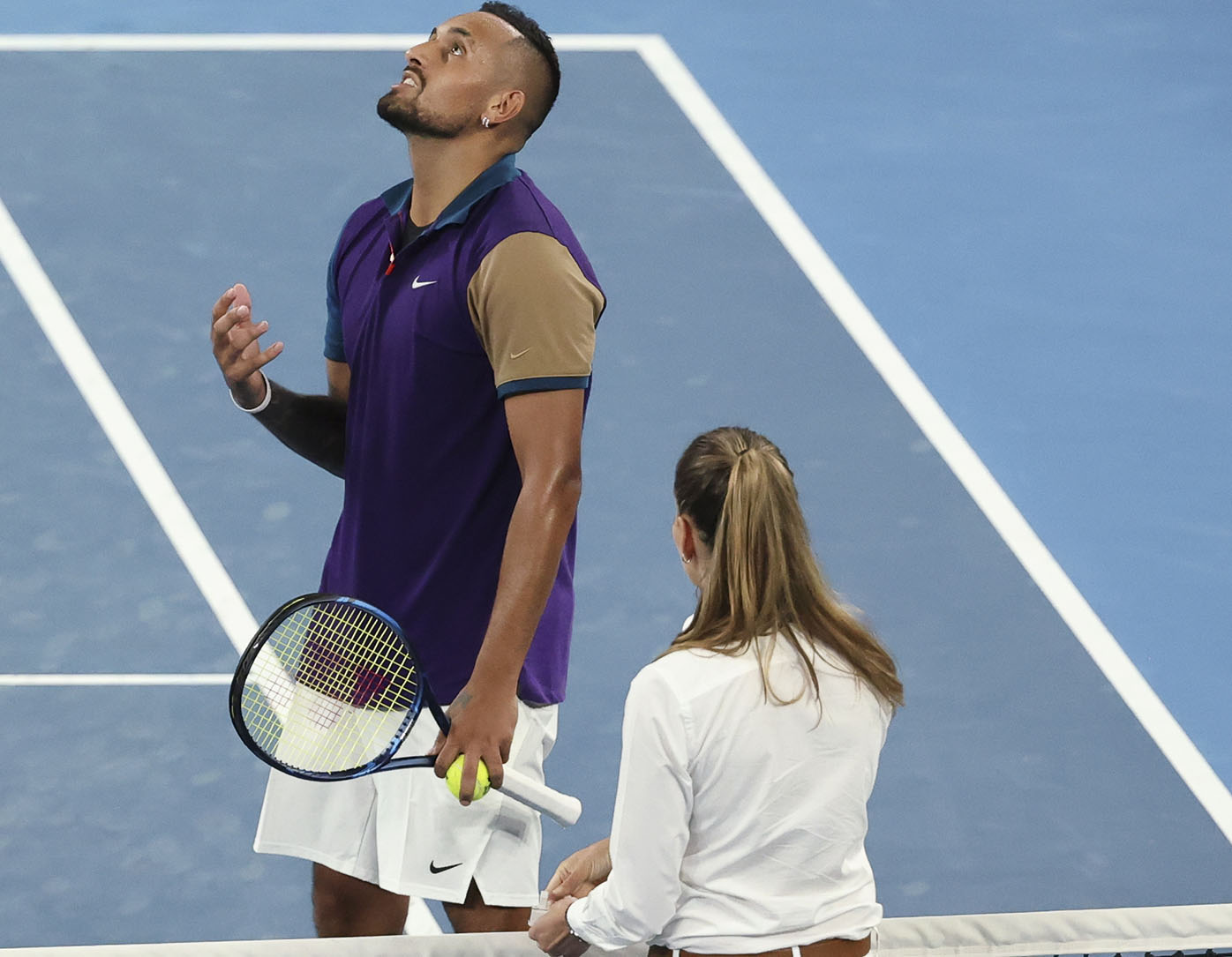 Nick Kyrgios was involved in several furious exchanges with chair umpire Marijana Veljovic in his epic five-set win over Ugo Humbert on Wednesday night, when service winners were repeatedly ruled out by what Kyrgios believed were false let signals.
