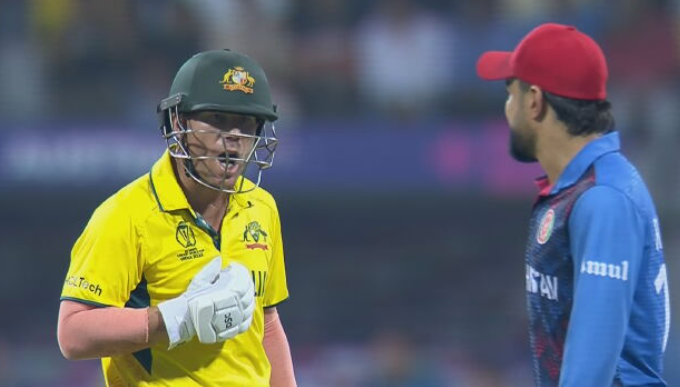 David Warner and Rashid Khan were seen in a heated exchange during Australia's ICC World Cup win over Afghanistan.