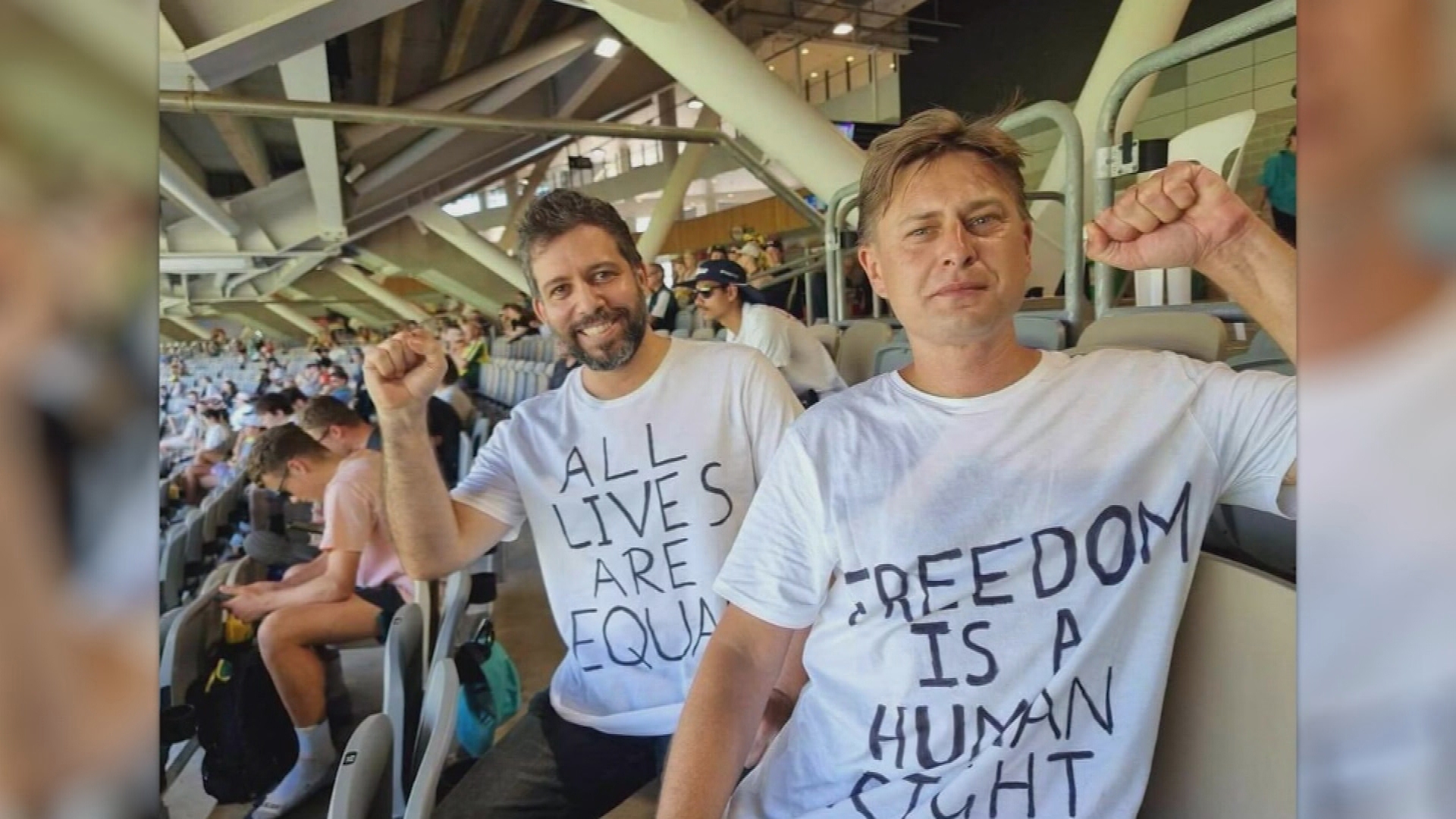 Two fans were kicked out of the first Test between Australia and Pakistan at Perth Stadium, after displaying a banner that reading "All lives are equal. Freedom is a human right".
