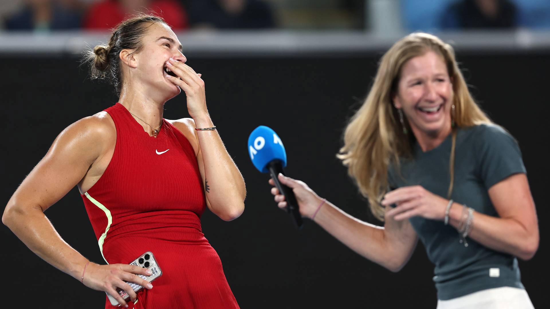 After the win, Sabalenka was quizzed on a new pre-match routine during her on-court interview, which entails her signing the head of one of her trainers, admitting it has become a superstition.