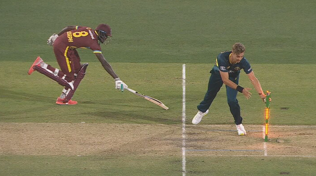 With 52 runs needed off 10 balls, West Indies tail-ender Alzarri Joseph hit a Spencer Johnson delivery to Mitchell Marsh. Marsh threw the ball in and Johnson removed the bails in a close chance but it appeared no one appealed.