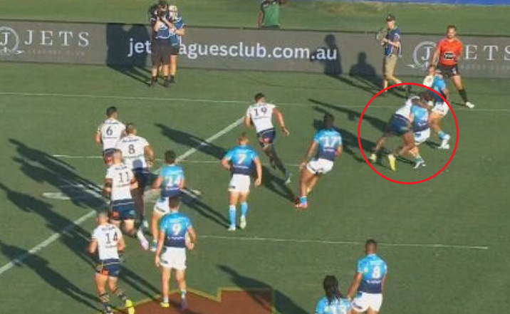 Midway through the second half of the Titans' trial match, Brimson shifted the ball from centre to the wing with Sivo flying in and collecting him high.