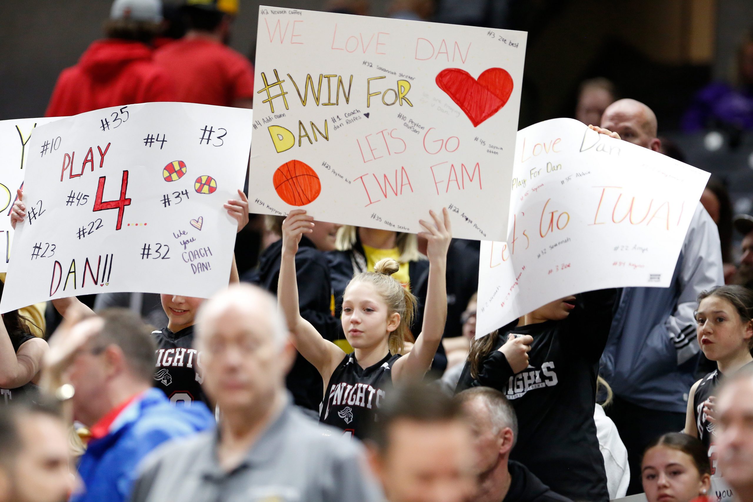 Incarnate Word fans hold up signs honoring head coach Dan Rolfes, Saturday, March 16, 2024, at Mizzou Arena in Columbia, Mo. Rolfes experienced a medical emergency following a semifinal game Friday and was unable to coach the championship game.