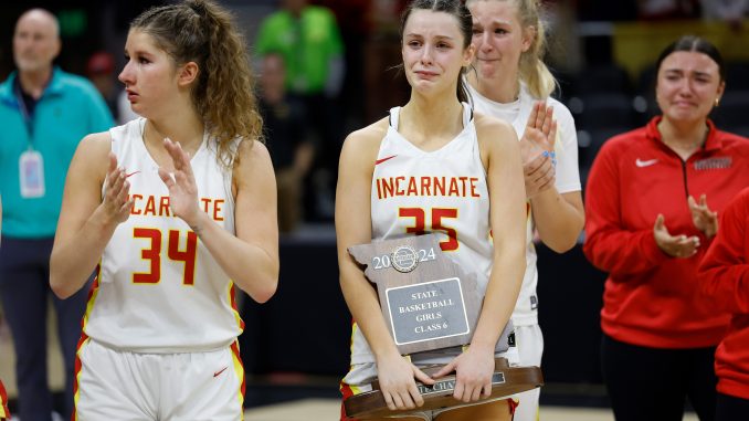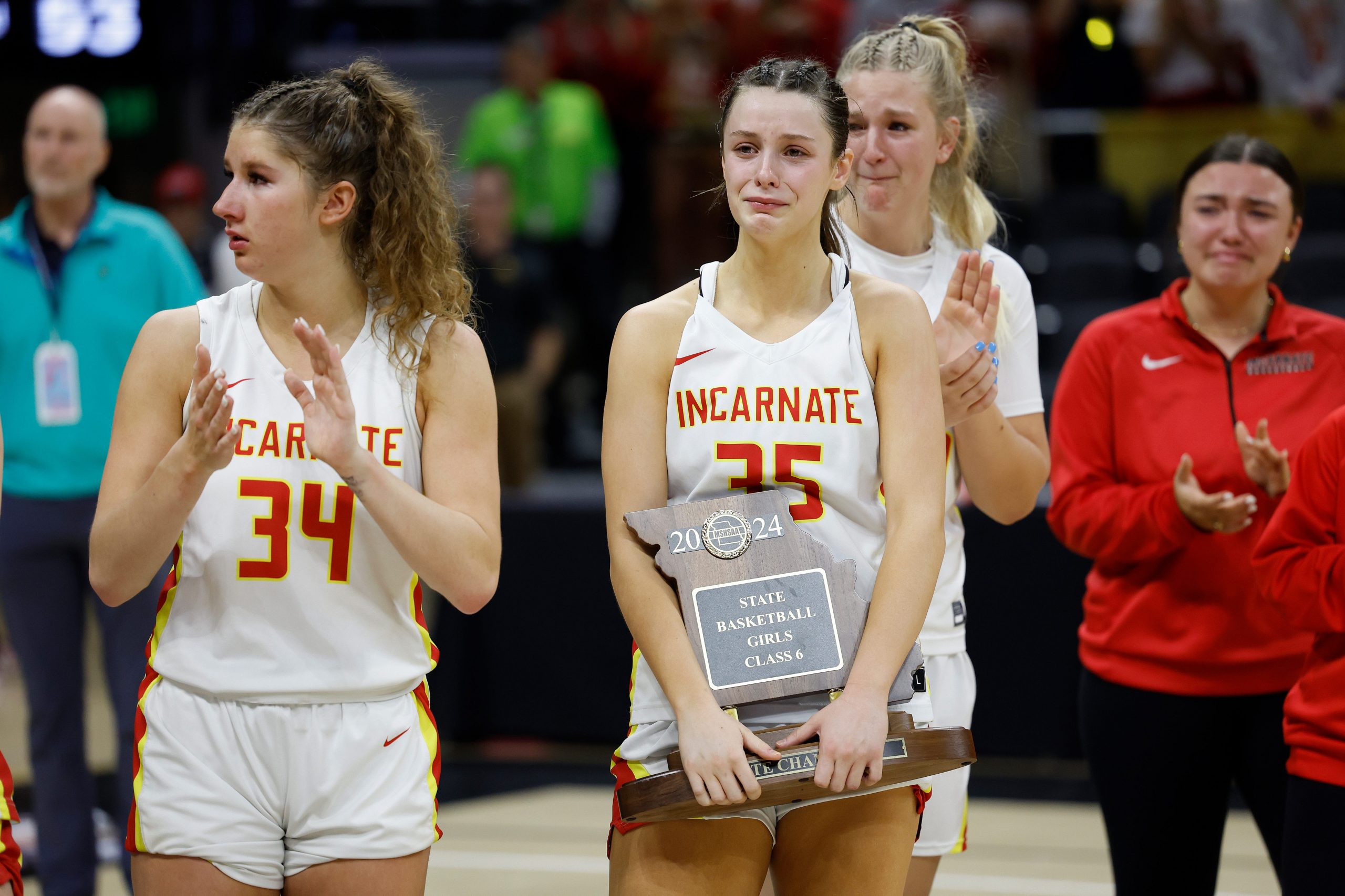 Incarnate Word’s Abbie Sextro (35) holds the championship trophy following a Class 6 state championship girls basketball game between Kickapoo and Incarnate Word, Saturday, March 16, 2024, at Mizzou Arena in Columbia, Mo.