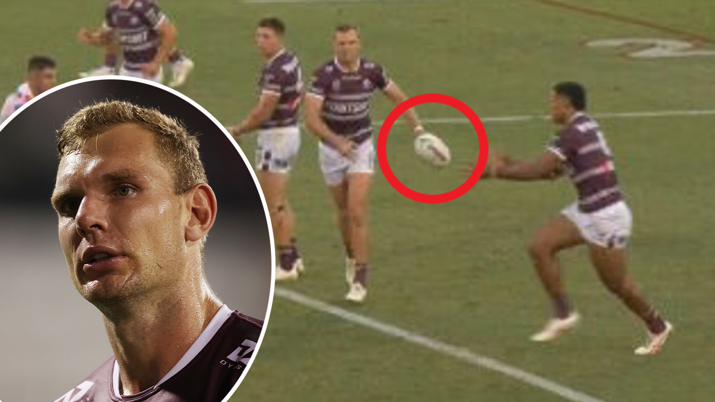 Manly Sea Eagles star Tom Trbojevic produced one of the more bizarre moments of his spectacular career after delivering a blatant forward pass to Taniela Paseka.