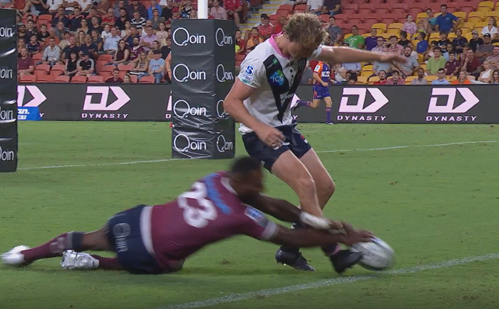 The Rebels halfback got his boot to the ball just in time as the former Melbourne Storm man swooped in the in goal to claim a try.