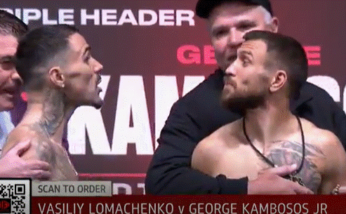 In comical scenes, Lomachenko refused to budge and maintained eye contact with Kambosos as he was being led away.