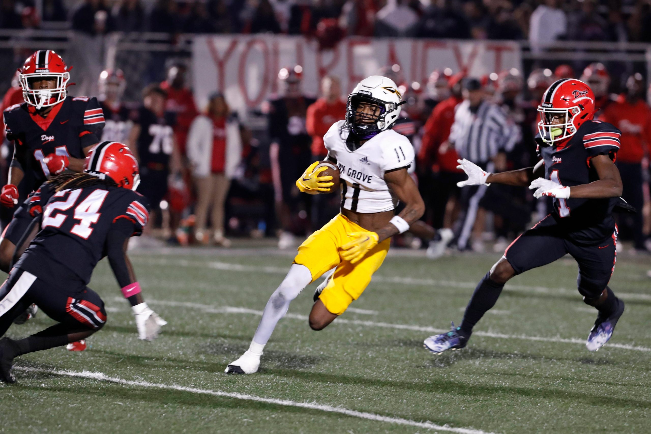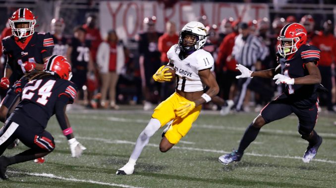 Oak Grove High School’s PJ Woodland (11) runs the ball during the 7A tournament game against Brandon High School in the 2023 high school football championships on Saturday, Nov. 24, 2023 in Brandon, Miss.
