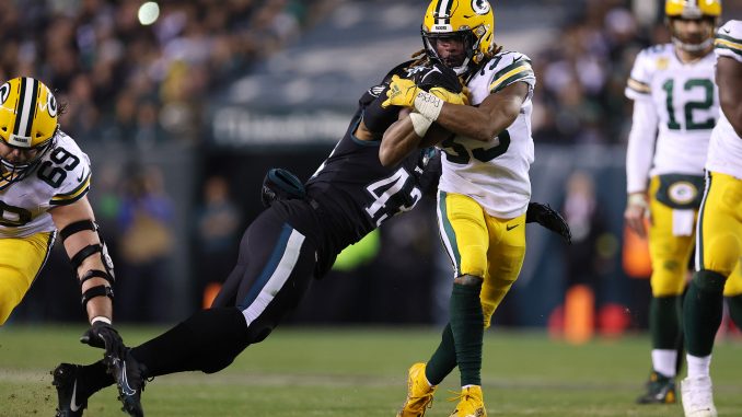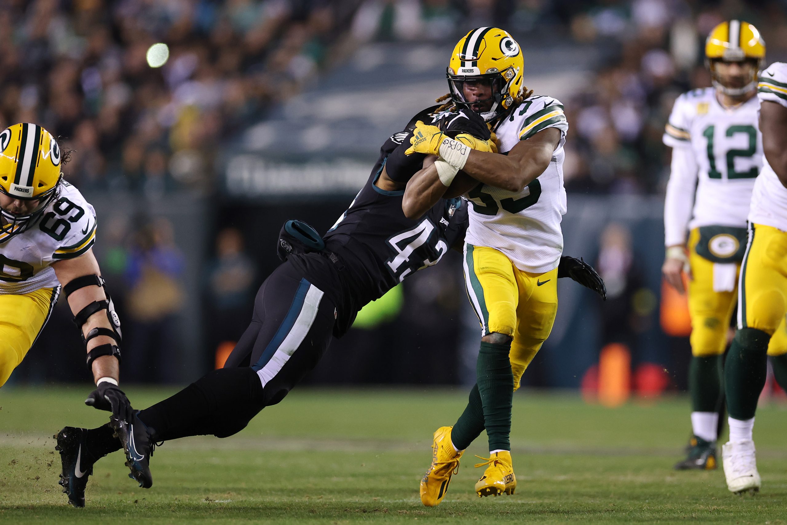 Kyzir White #43 of the Philadelphia Eagles attempts to tackle Aaron Jones #33 of the Green Bay Packers during the second half at Lincoln Financial Field on November 27, 2022 in Philadelphia, Pennsylvania. (Photo by Scott Taetsch/Getty Images)