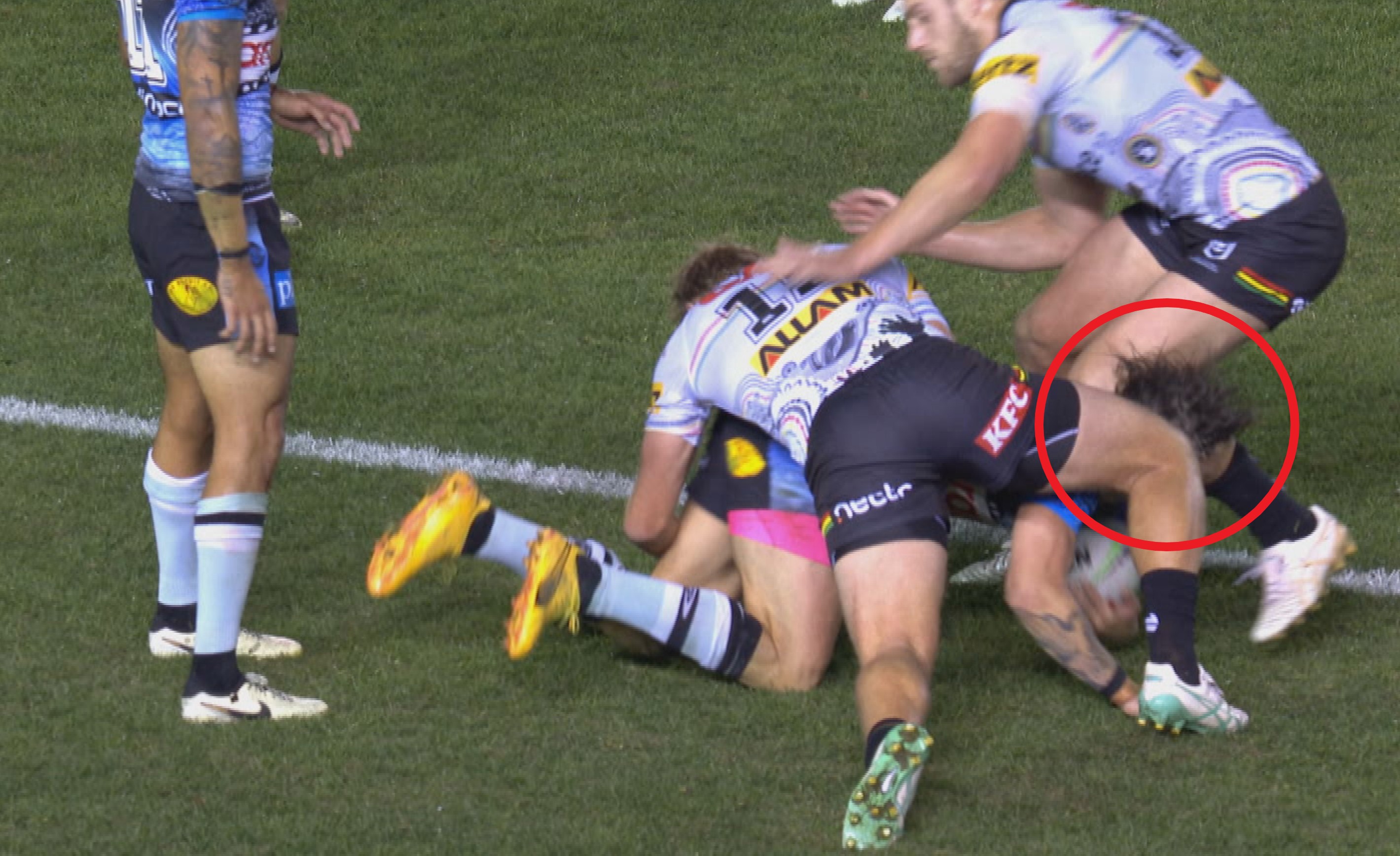 In the midst of a first-half onslaught from Penrith, the halfback copped an ugly knee to the head and was spotted in back play feeling the effects.