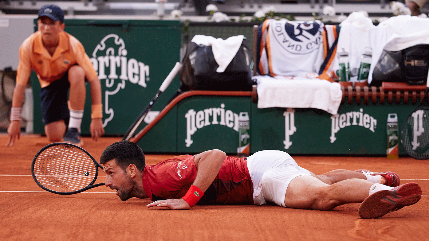 At 2-1 in the crucible of the fifth set, Djokovic’s feet gave way as he chased a ball to his right, and he rolled on the ground, caking his white shorts, his red shirt and parts of his arms and legs with the rust-coloured clay. As he walked to the sideline to grab a bottle of water to clean off, he gave a piece of his mind to anyone who would listen, renewing an earlier complaint about wanting the court to be swept to improve traction.