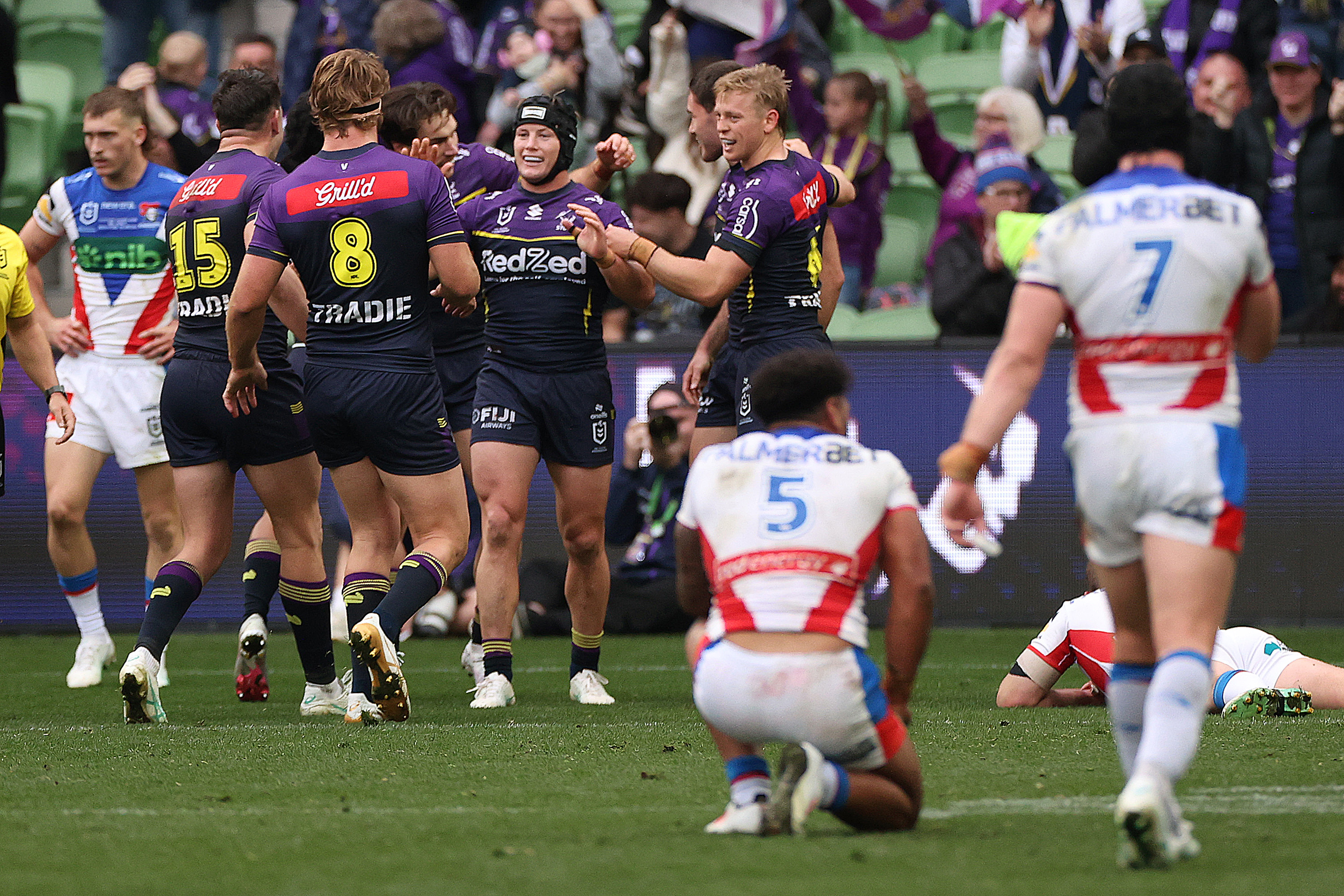 Melbourne Storm have claimed top spot on the NRL ladder after defeating the Newcastle Knights 34-28 in a thrilling contest at AAMI Park on Sunday afternoon.
