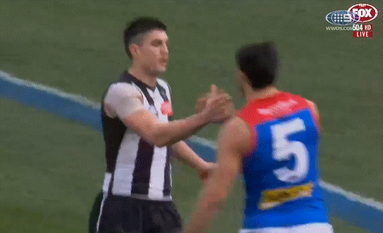 While the fans kept their end of the deal, incessantly booing the Magpie enforcer when he touched the ball, at the start of the match cameras caught Christian Petracca shaking hands with Maynard, while giving him a friendly tap on the head as the villain in the story reciprocated with a pat on the backside.