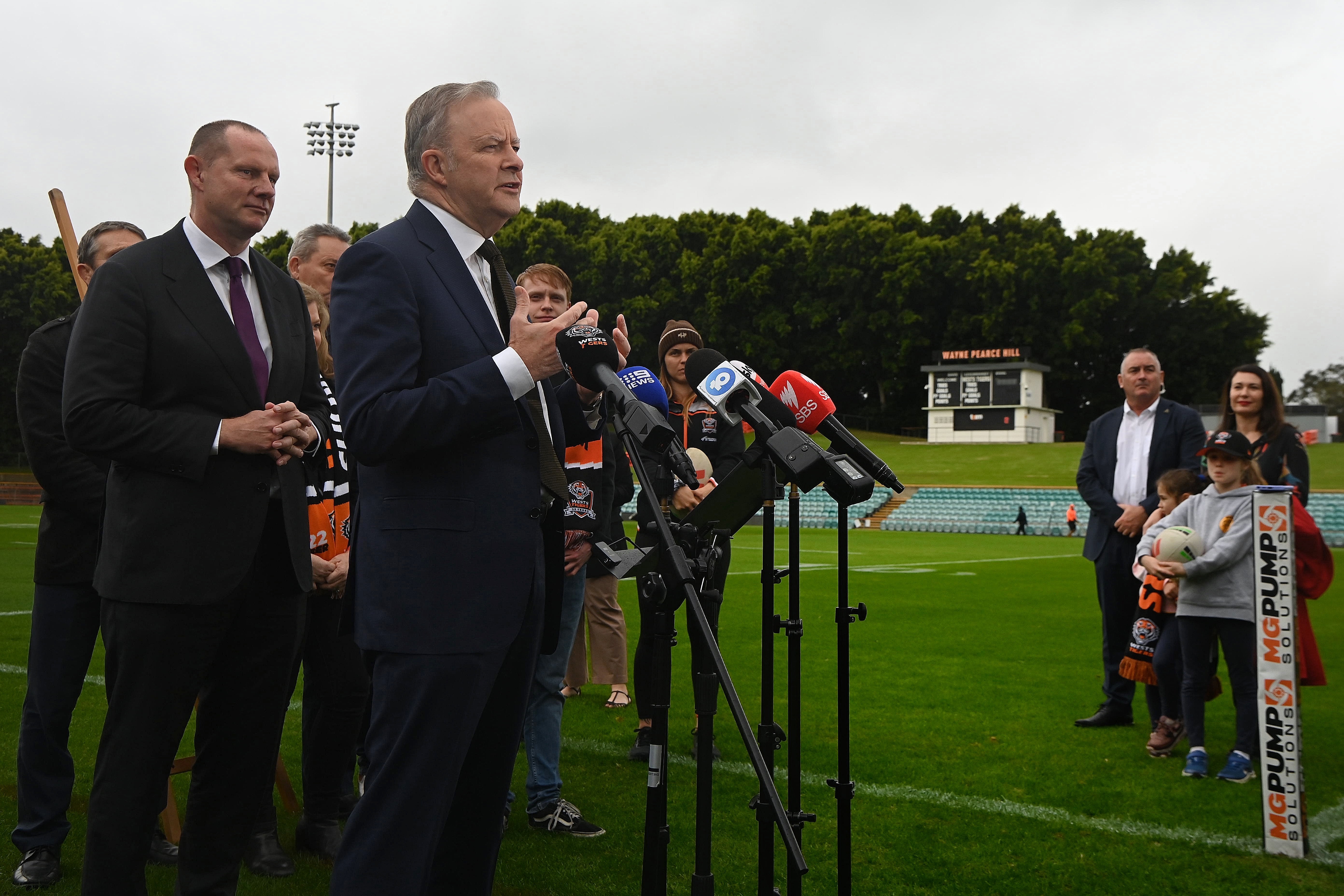 Balmain greats Wayne Pearce and Steve Roach both featured in the background of Albanese's press conference, along with ARLC chairman Peter V'landys and NRL CEO Andrew Abdo.