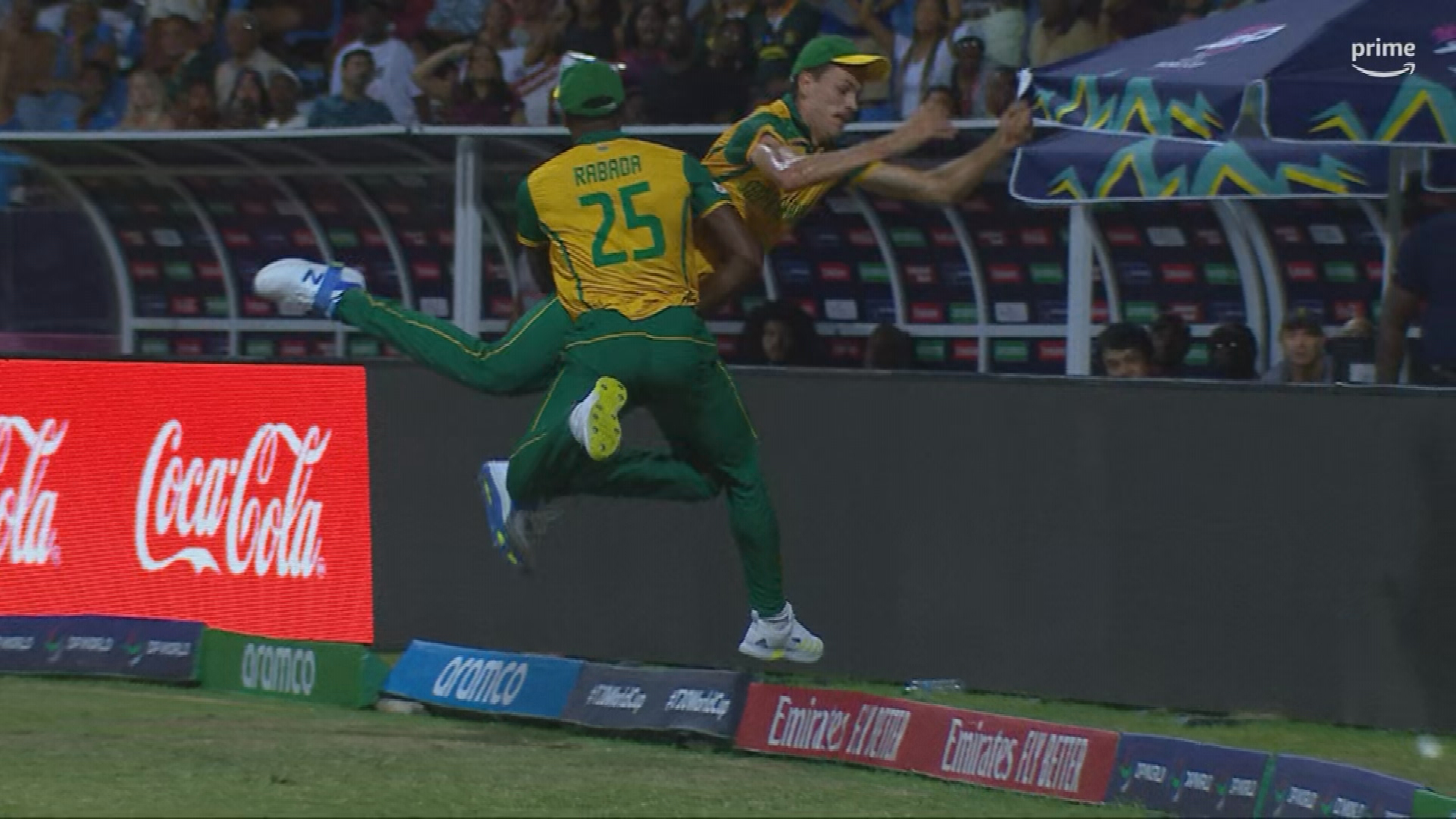 "Where was the communication? Both bowlers, both down, this is not good for South Africa. Long off and long on, Both coming together, both eyes on the ball but what about each other? Now that's a heavy blow … Jansen is in real trouble."